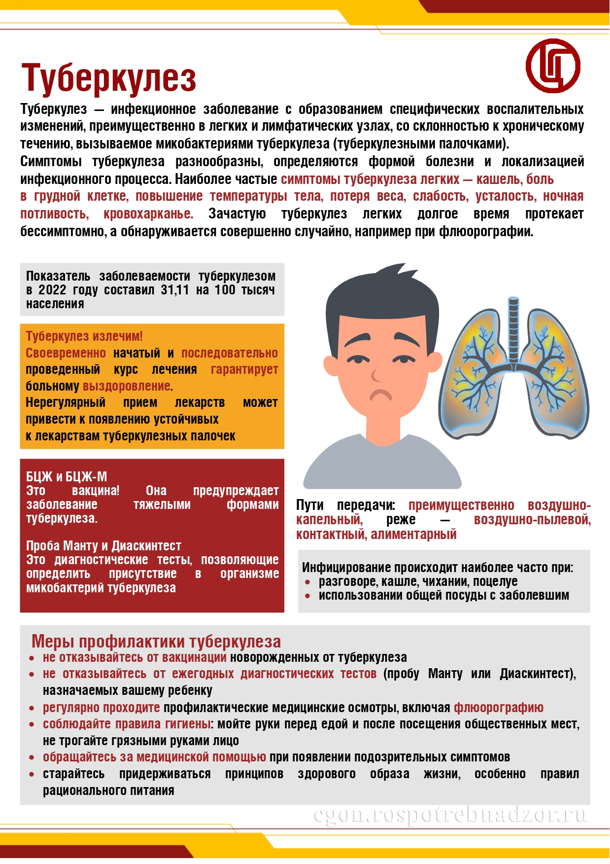 Симптомы туберкулеза разнообразны, определяются формой болезни и локализацией инфекционного процесса. Наиболее частые симптомы туберкулеза легких — кашель, боль в грудной клетке, повышение температуры тела, потеря веса, слабость, усталость, ночная потливость, кровохарканье. Зачастую туберкулез легких долгое время протекает бессимптомно, а обнаруживается совершенно случайно, например при флюорографии. Пути передачи: преимущественно воздушно-капельный, реже — воздушно-пылевой, контактный, алиментарный Инфицирование происходит наиболее часто при: разговоре, кашле, чихании, поцелуе использовании общей посуды с заболевшим Туберкулез излечим! Своевременно начатый и последовательно проведенный курс лечения гарантирует больному выздоровление. Нерегулярный прием лекарств может привести к появлению устойчивых к лекарствам туберкулезных палочек.